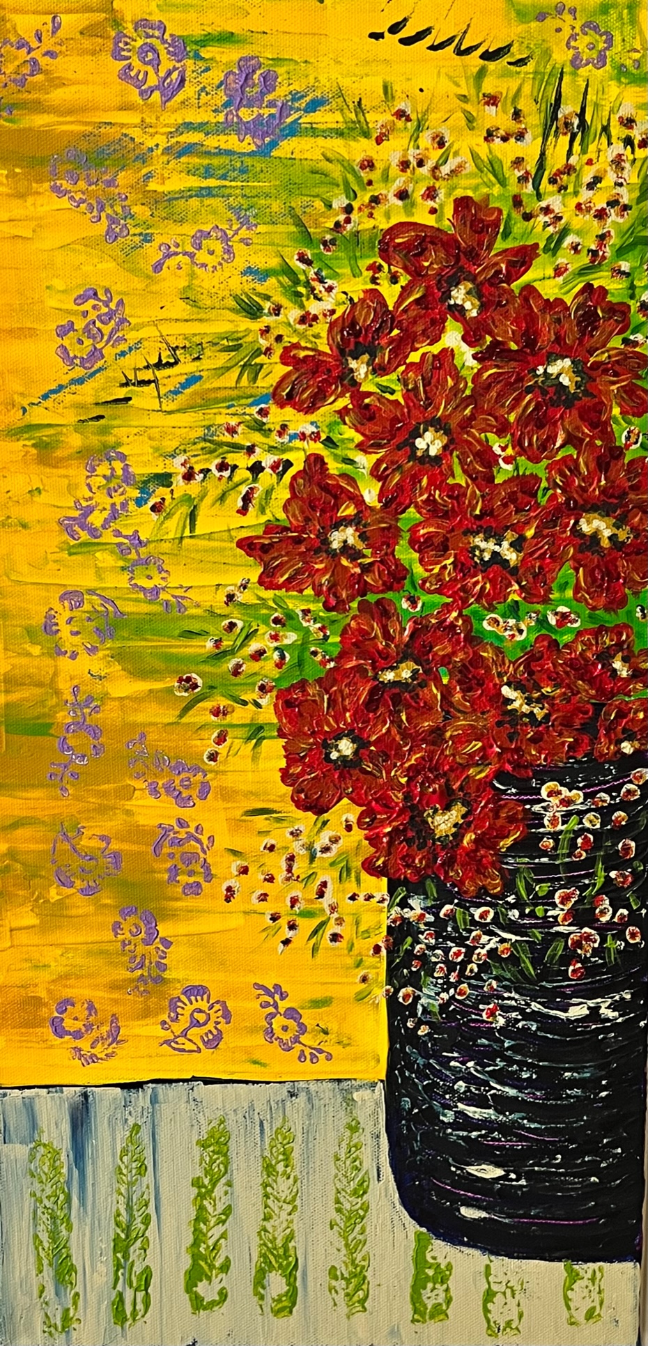 25"x15" acrylic on stretched canvas and framed in a yellow frame.